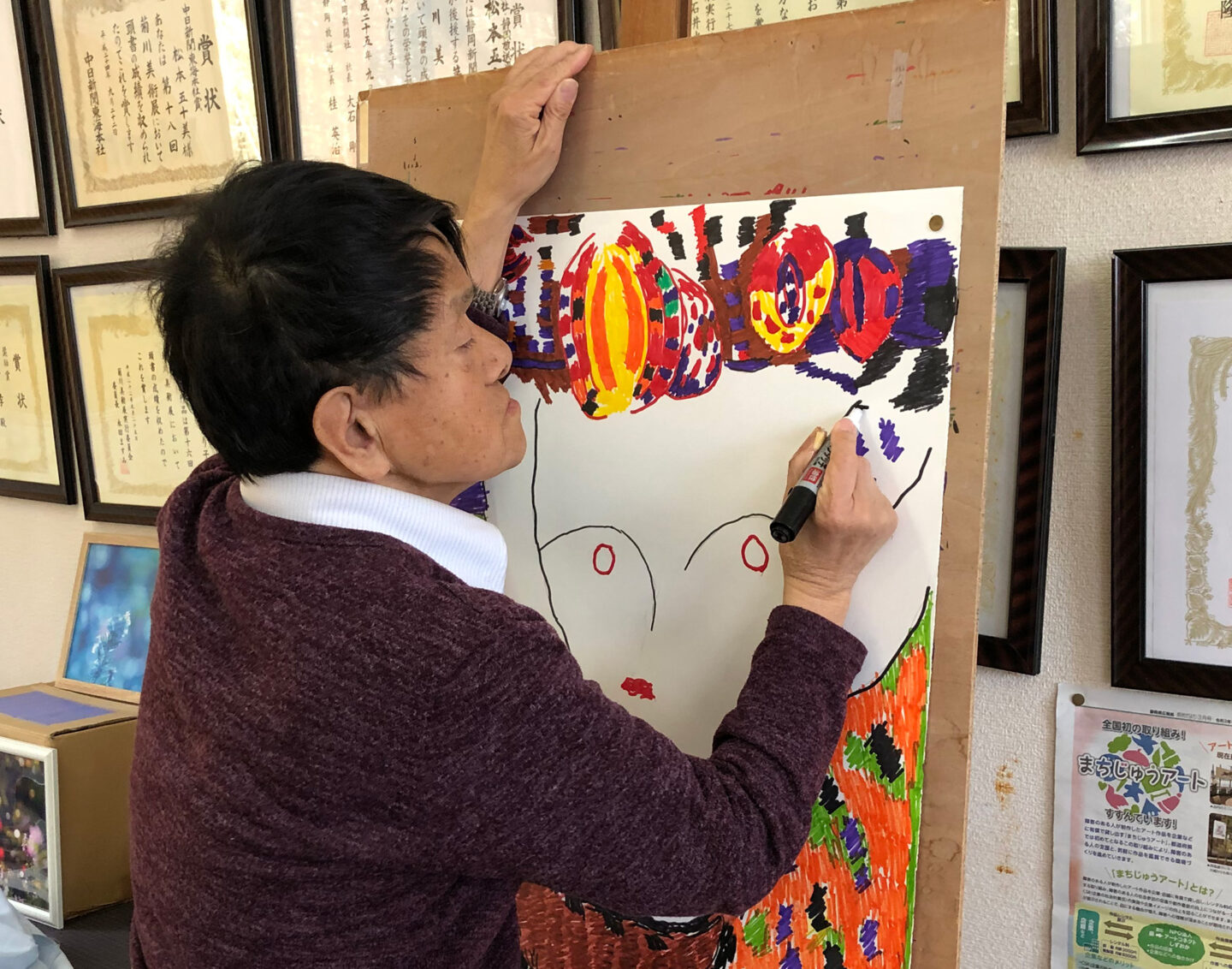 マーカーを使って描く。高齢化に伴い集中力にムラが出るようになってきたが、それでも描く事や作品展出品、受賞などの願望があり、楽しく参加している。女性の絵を描くのが好き。