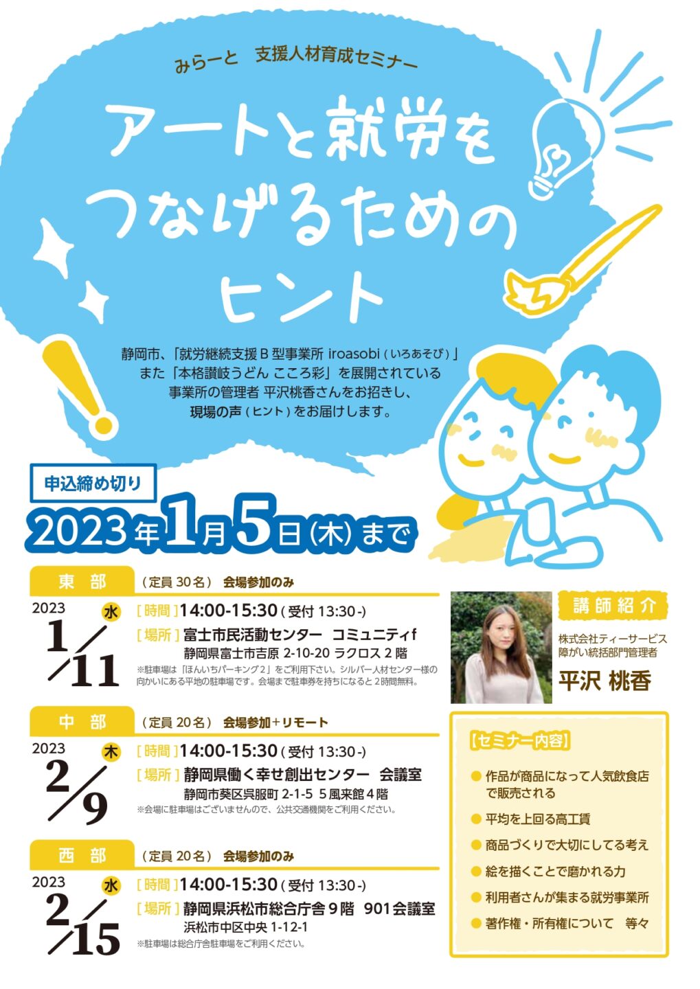 静岡県障害者文化芸術活動支援センター みらーと主催の支援人材育成セミナーを東部地区、中部地区、西部地区で開催いたします。(中部会場のみリモート参加あり)