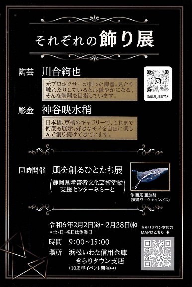 風を創るひとたち西部展 日時 2024年2月2日(金)~28日(水) 9:00~17:00 土日祝休 ※会場の都合により、早めに施錠する場合がございます。予めご了承ください。 会場 浜松磐田信用金庫きらりタウン支店 静岡県浜松市浜名区(旧浜北区)染地台3-32-19 「風を創るひとたち西部展」開催致します。 出展※敬称略 西尾 亜加梨(天竜ワークキャンパス) 森 大記(恵松学園) くるみ共同作業所 同時開催「それぞれの飾り展」 地域の作家2名による「彫金」と「陶芸」作品展示会です。 お誘い合わせの上、皆様どうぞお越し下さい。 浜松磐田信用金庫きらりタウン支店