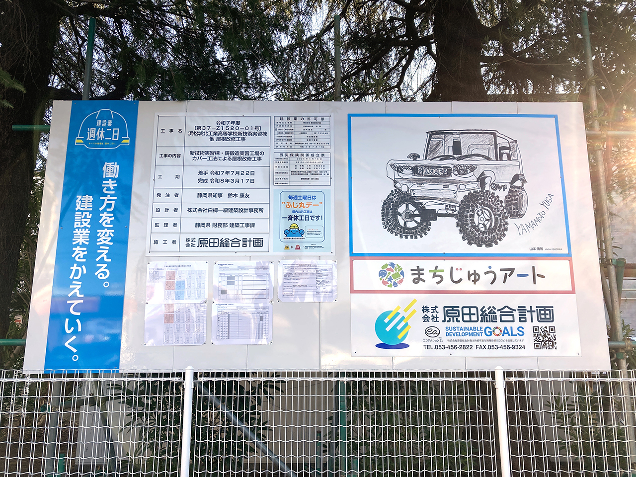 | 展示場所 | 【展示場所】 浜松城北工業高等学校新技術実習棟他屋根改修工事 工事看板に掲示 静岡県浜松市中央区住吉5丁目16-1 【企業住所】 株式会社原田総合計画 静岡県浜松市中央区上浅田1丁目11-30 |