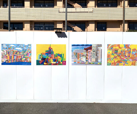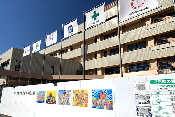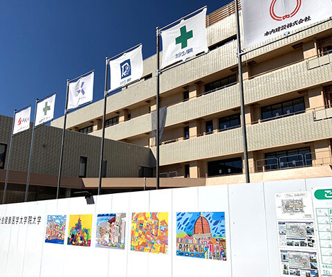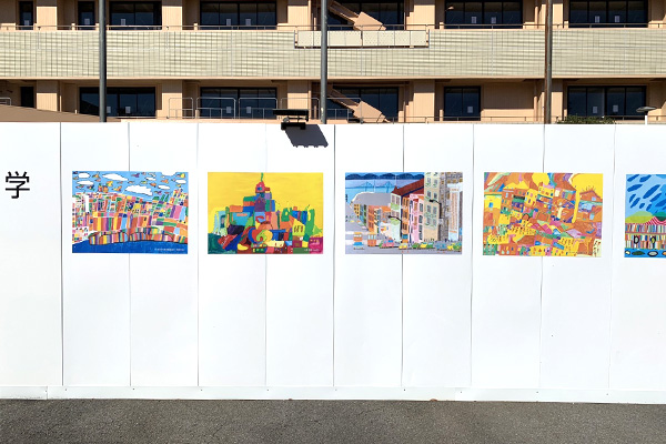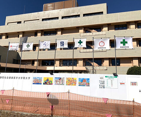 工事中の静岡社会健康医学大学院大学敷地内の工事壁面にまちじゅうアートを展示していただいております。