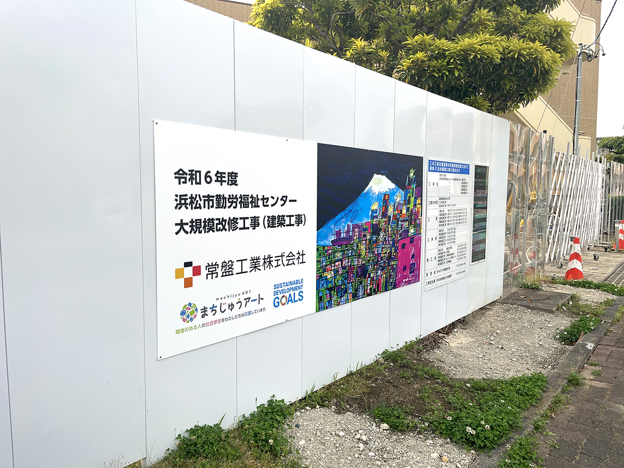 | 展示場所 | 【展示場所】 令和6年度 浜松市勤労福祉センター大規模改修工事 浜松市中央区船越町11-11(※勤労福祉センター) 工事仮囲いに設置 【企業住所】 常盤工業株式会社 静岡県浜松市中区新津町197番地 |