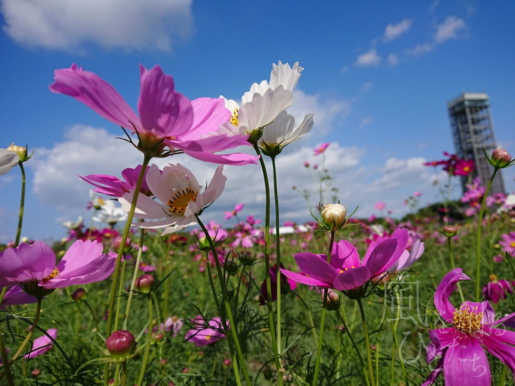 ガーデンパークの展望塔と秋桜が調和しています。