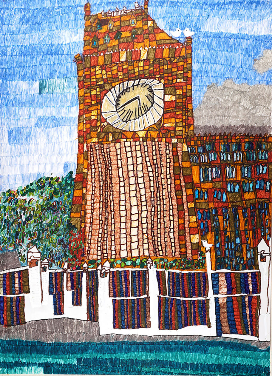 ビックベン 作品番号 00806 紙にマーカー・ペン B1/縦 (728×1,030mm) まちじゅうアート 参加作品 八木 優太 Yuta Yagi 作家詳細 著作者の許諾を得て掲載しています。画像等の複製・無断掲載を禁じます。 八木 優太の作品 ふぁいんだー美術館