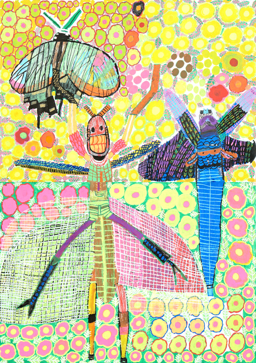 B2サイズの作品2点の上下を合わせると、大きな昆虫が出てきます。