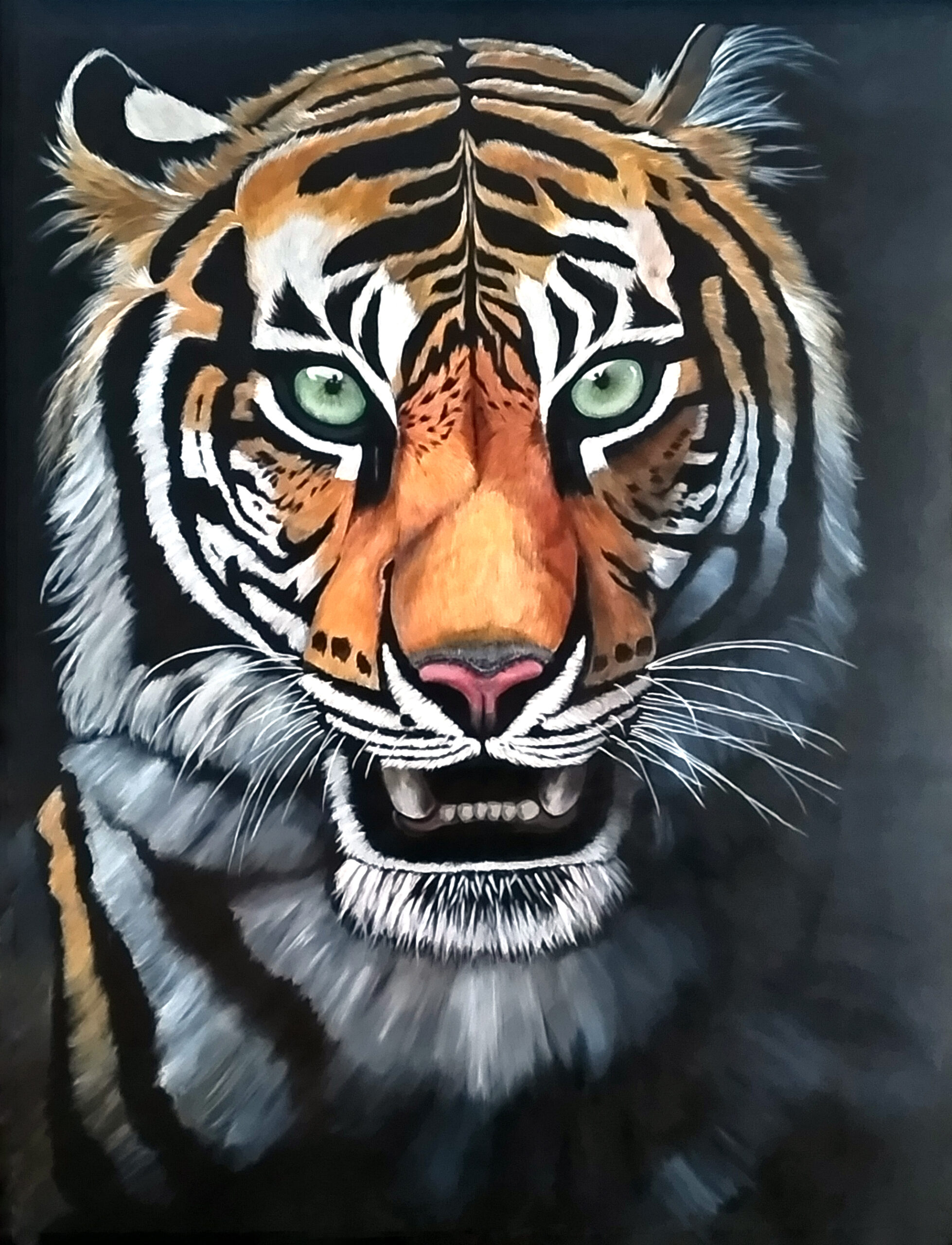 大きなキャンバスを使って獲物を狙う鋭い眼差しや繊細な毛並みを表現しています